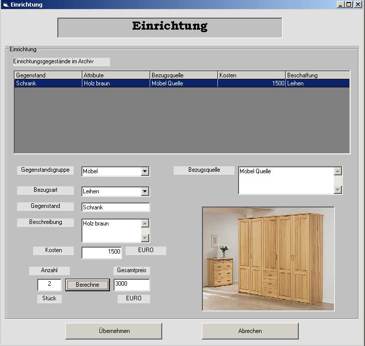 In dem Fenster werden sämtliche Einrichtungsgegenstände