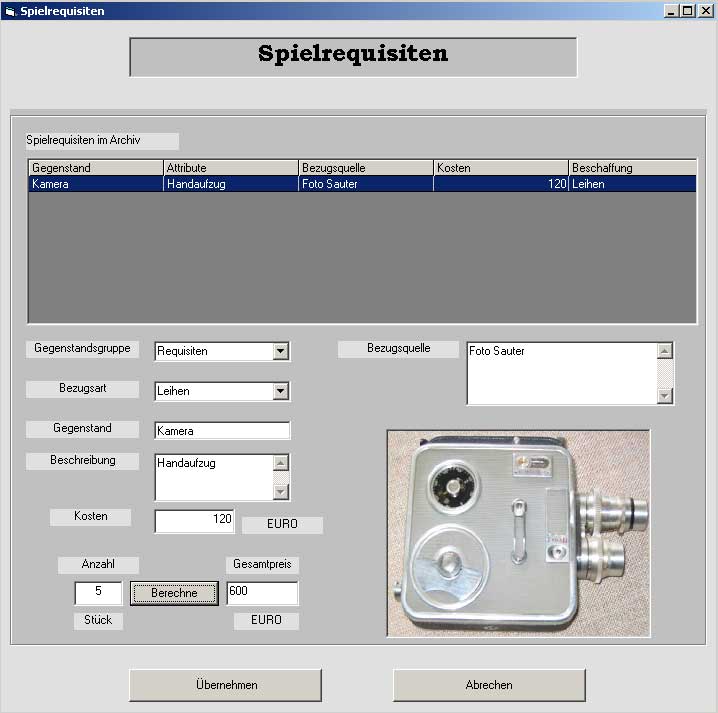 Spielrequisiten Verwaltung